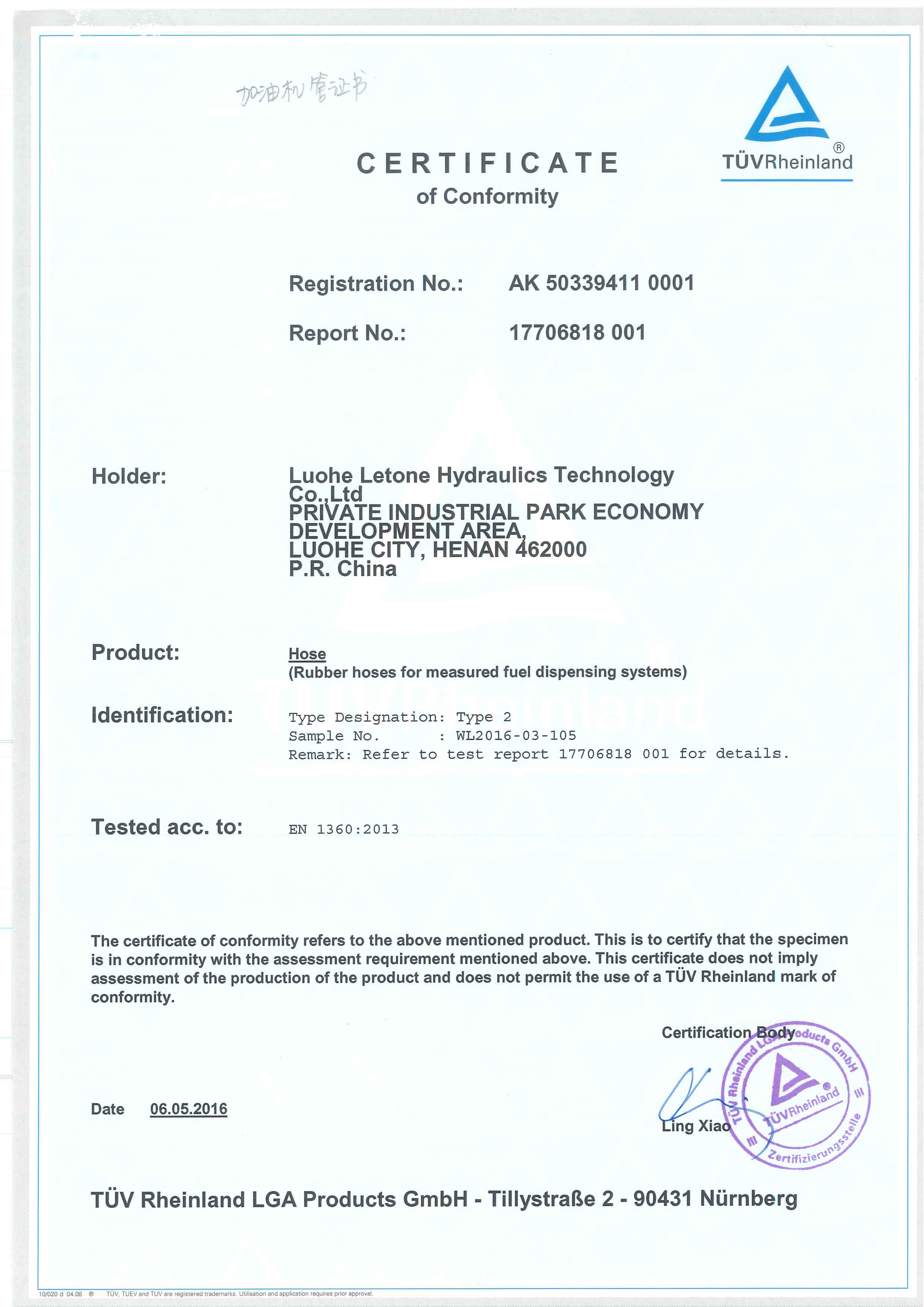 TÜV Rheinland Testing and Certification Certificate
