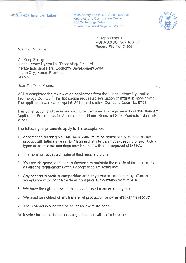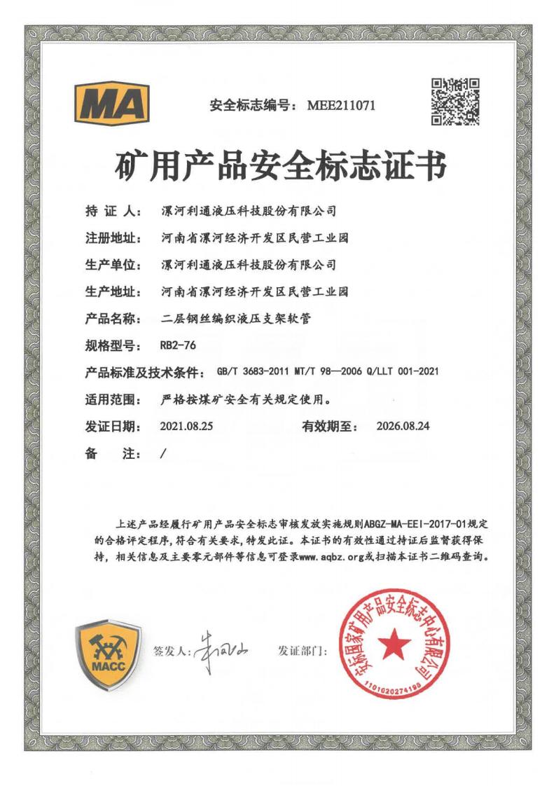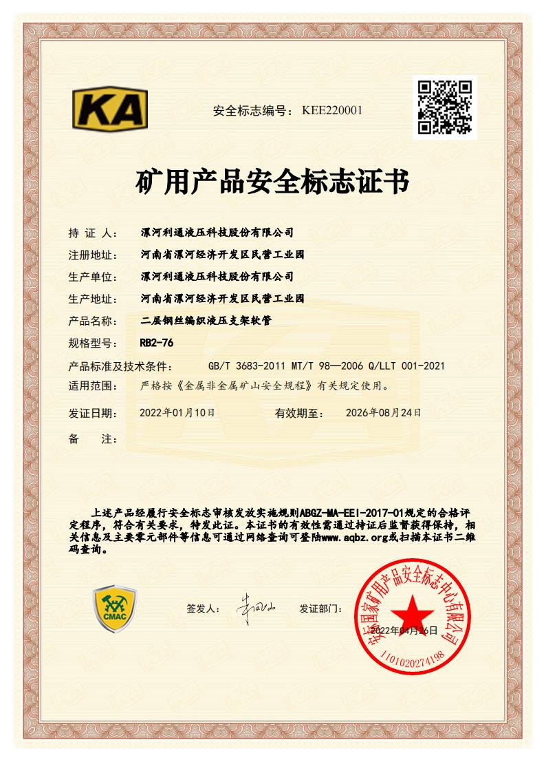 RB2-76 Product Coal Mine Safety Certificate
