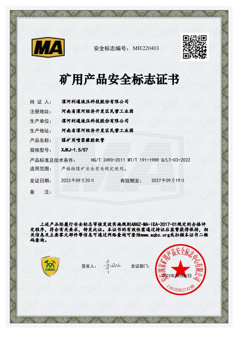 XJKJ-1.5-57 Product Mining Safety Certificate