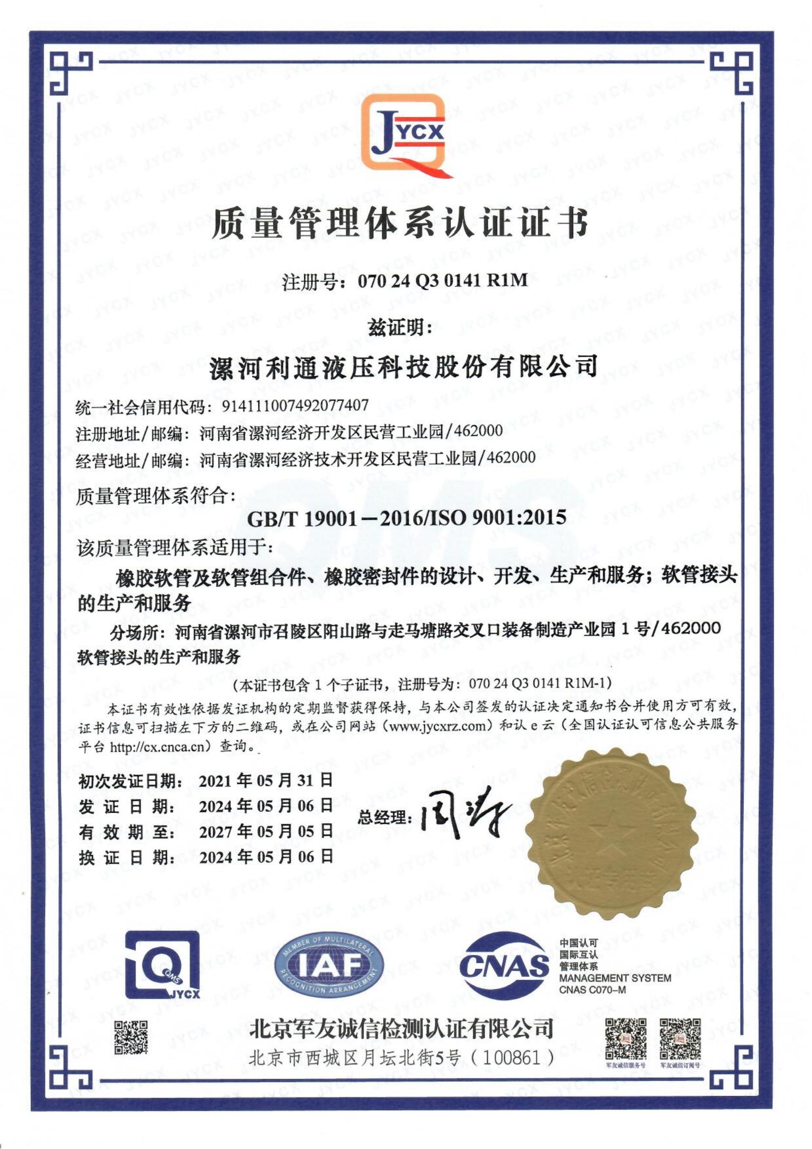 Quality Management System Certification Certificate (Junyou)
