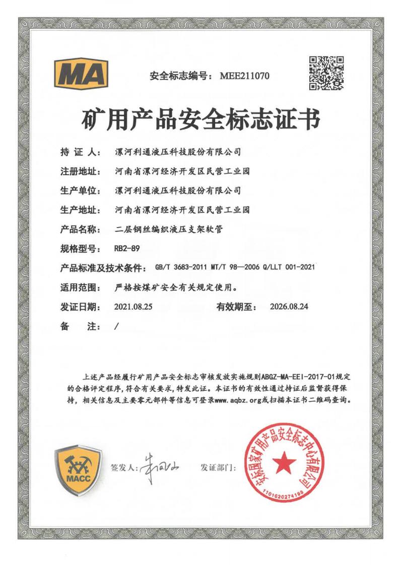 RB2-89 Product Coal Mine Safety Certificate