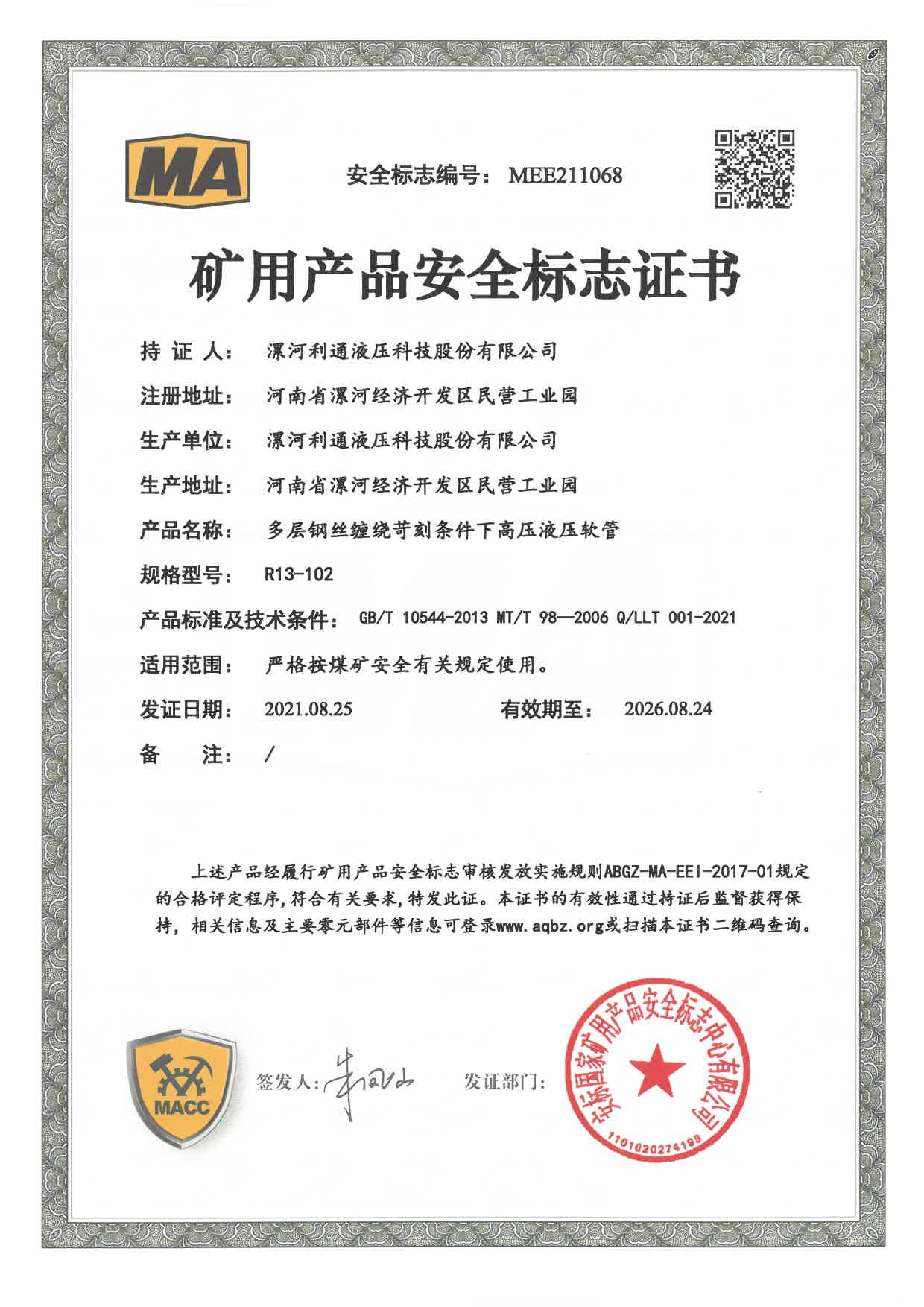 R13-102 Product Coal Mine Safety Certificate