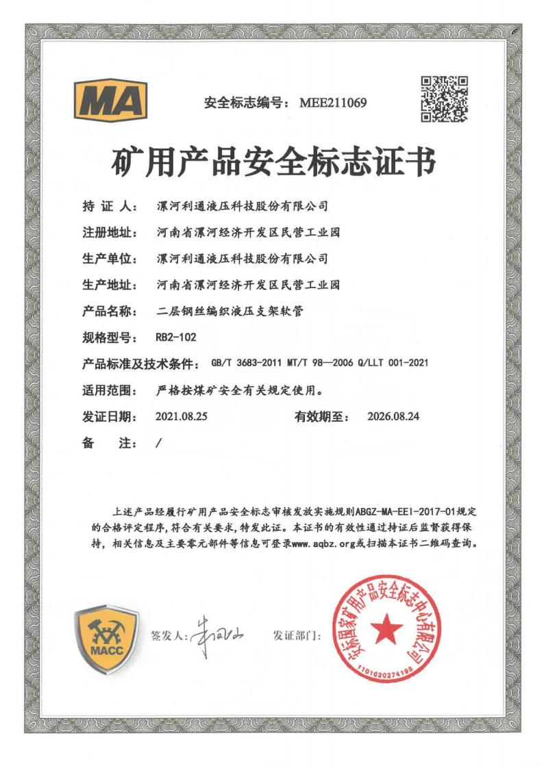 RB2-102 Product Coal Mine Safety Certificate