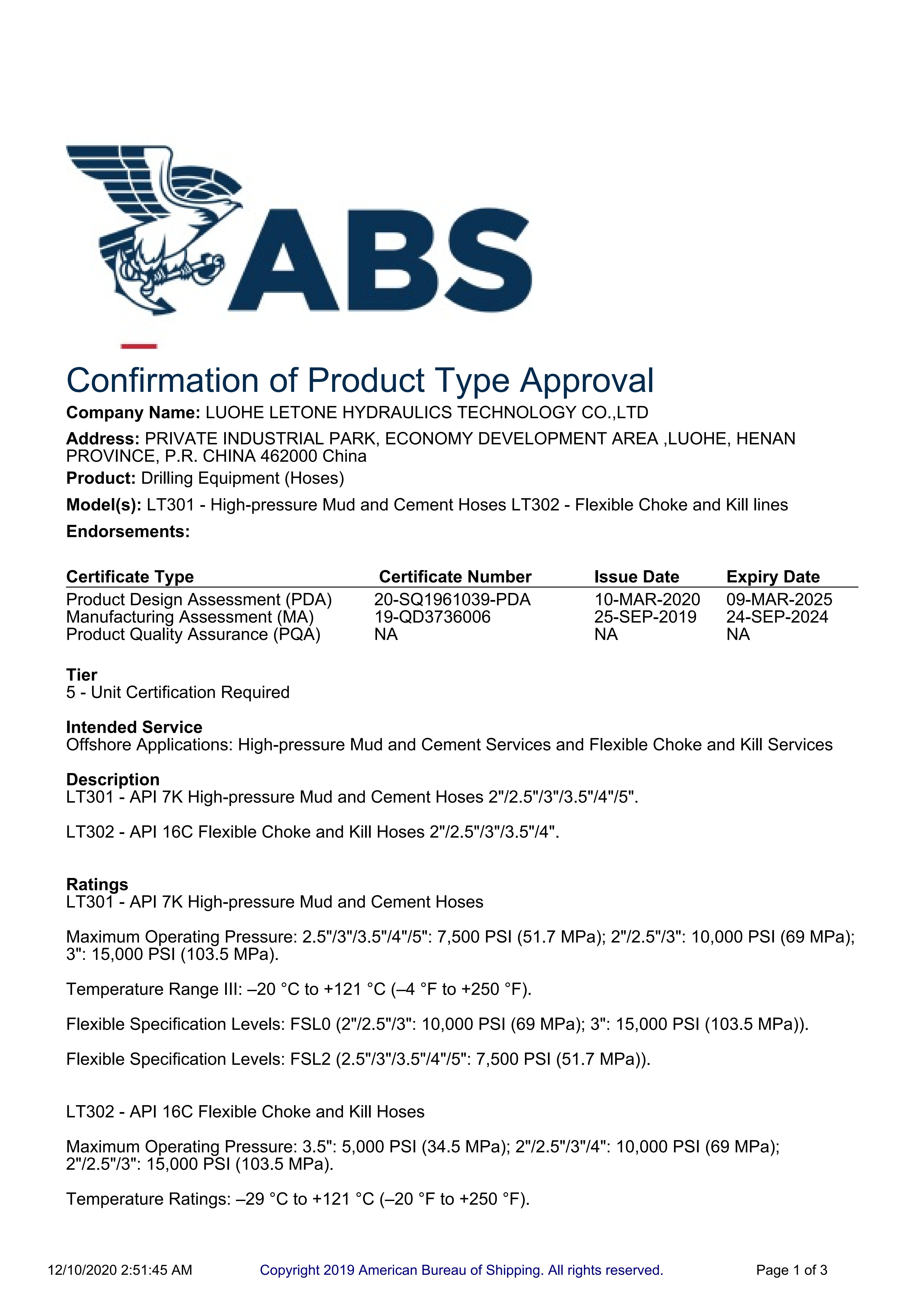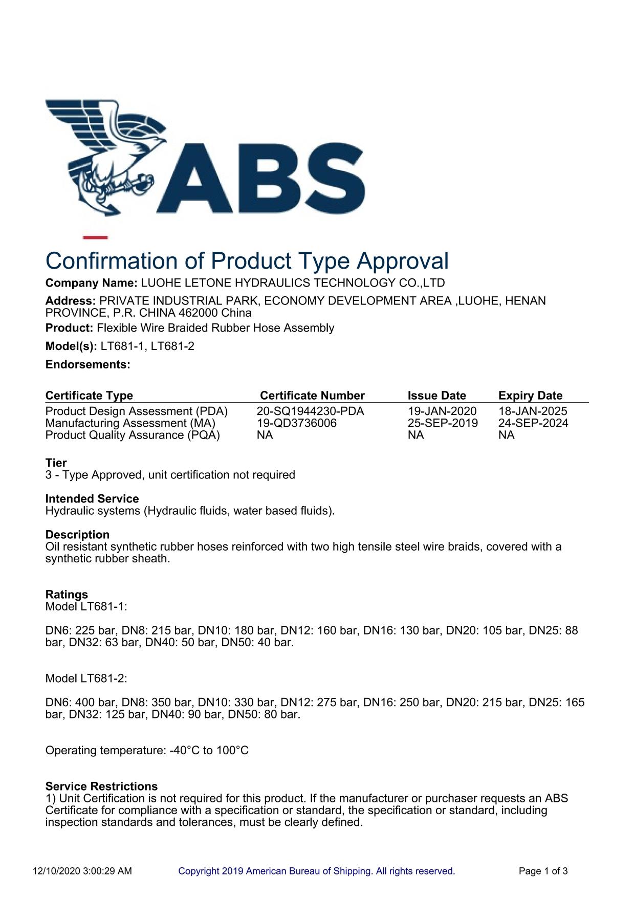 ABS type-approved hydraulic hose