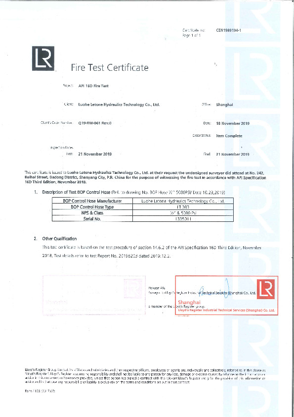 LR 16D Fire Resistance Test Certificate