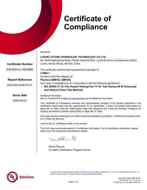 Relying on solid technical strength, the LT800 series liquid cooling pipeline products of Letone Technology have achieved UL94 V0 grade in core flame retardant performance. The after-flame burning time is less than 5 seconds with no burning drips generated after leaving the fire source.