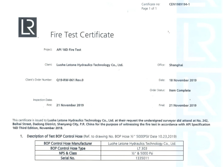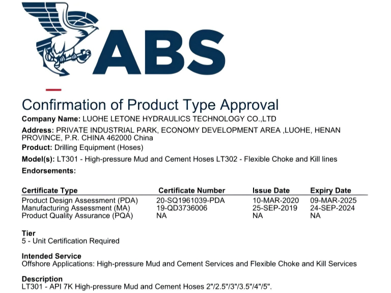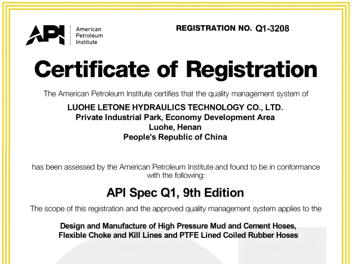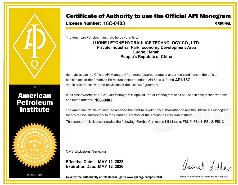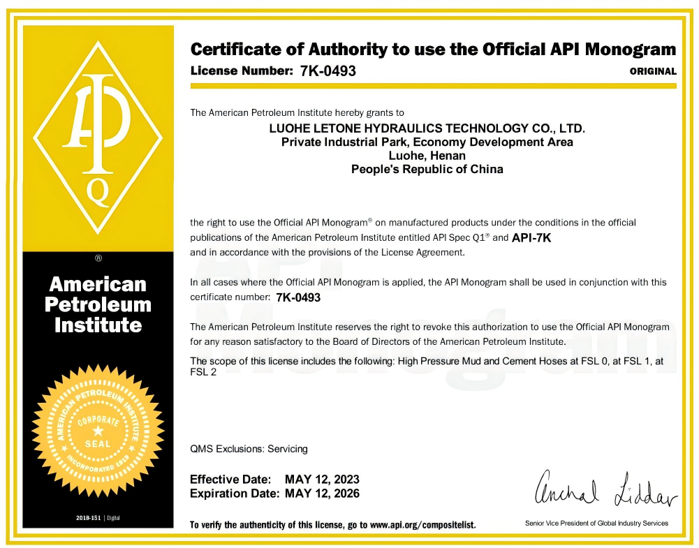 Technical Standards:API 17K certification is designed for deep-sea high-pressure environments, requiring hoses to have durability under extreme pressure (up to 600 MPa) and corrosive conditions. Letone Technology is the only company in China to hold triple certifications of API 7K, 16C, and 17K.