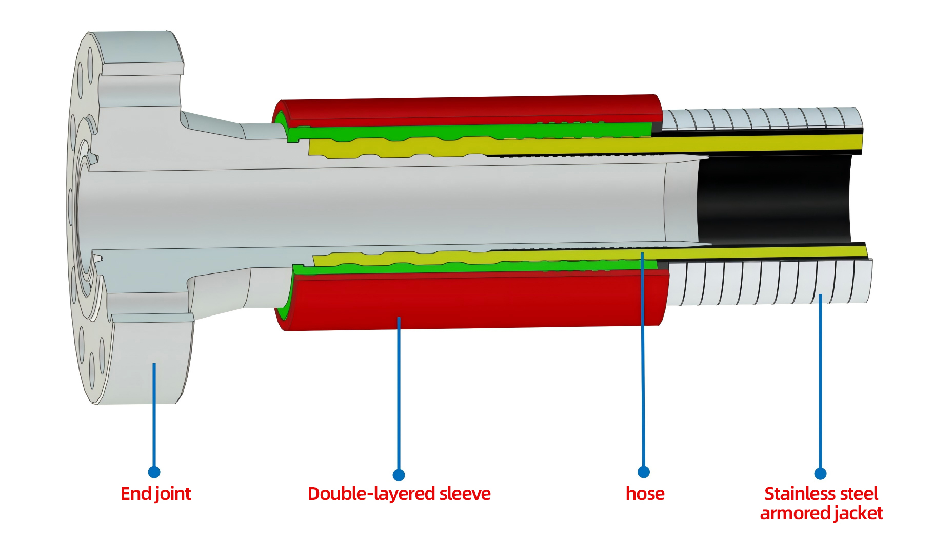 The connector is made of 35CrMo high-strength alloy steel, forged as a single piece, and undergoes a rigorous heat treatment process to ensure a uniform and fine metallographic structure and excellent pressure resistance. High-precision CNC machine tools and machining centers ensure dimensional accuracy and product interchangeability. The hose assembly consists of a hose and end connectors mechanically crimped together using a double-layer sleeve structure. The crimped connector and hose provide a physical connection, offering stable anti-detachment and sealing. The crimped assembly features a buffer layer with multiple venting gaps in the rubber layer, effectively guiding gas to the connector pull-out section and venting it through the crimping grooves to the outside of the connector, preventing bulging of the hose.
